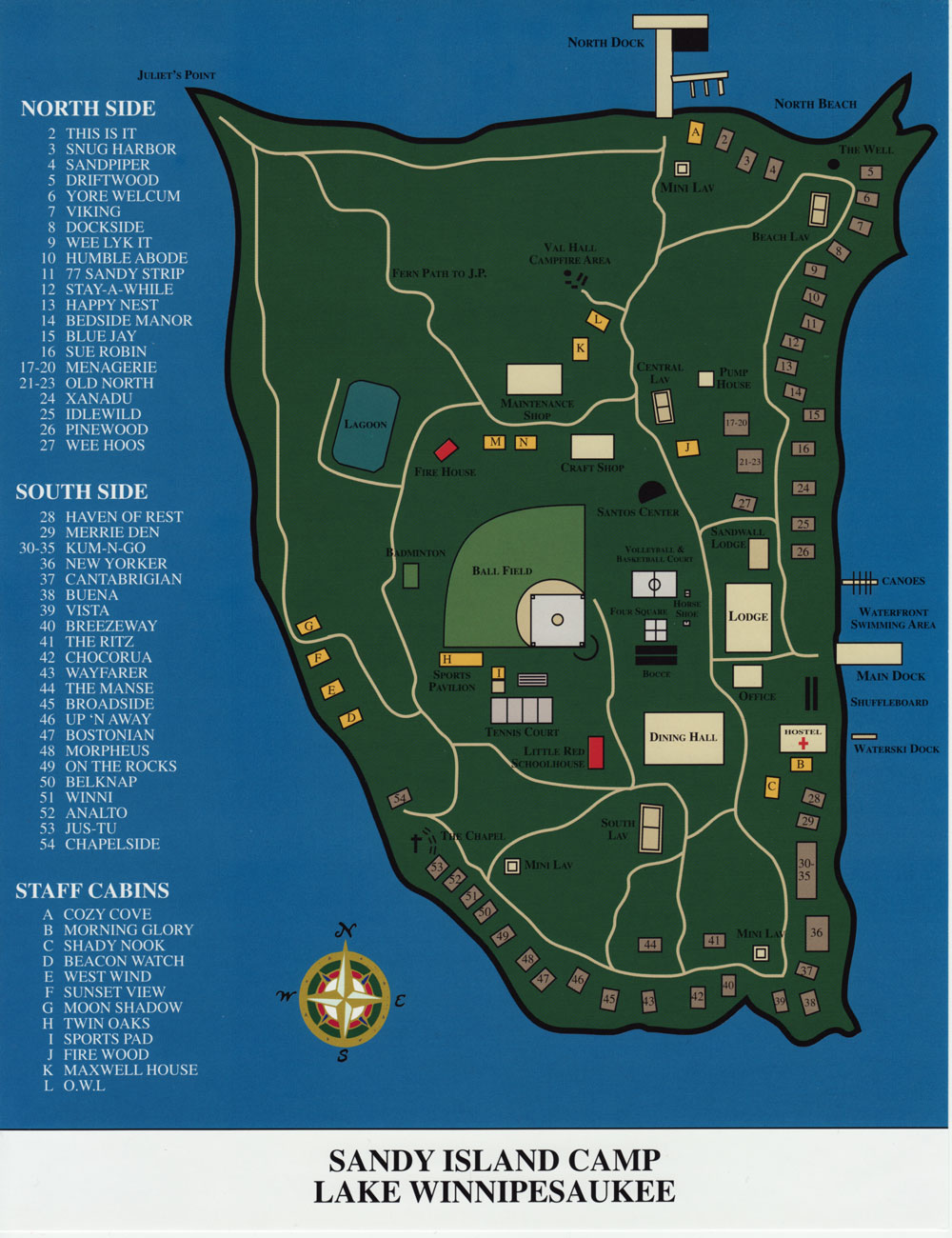 On the island there is a lodge, a dining hall, outdoor chapel, four square court, bocce court, ball field, volleyball & basketball court, horse shoe pit, tennis court, badminton court, lagoon, campfire area, shuffleboard, swimming area, canoes, and docks.